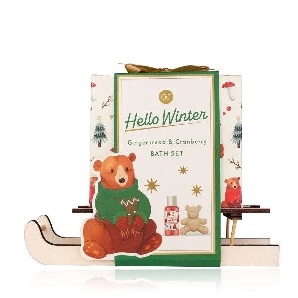 HELLO WINTER badset op een houten slee inclusief: 100ml douchegel en 90g zeep in beer vorm. Geur: peperkoek en veenbessen