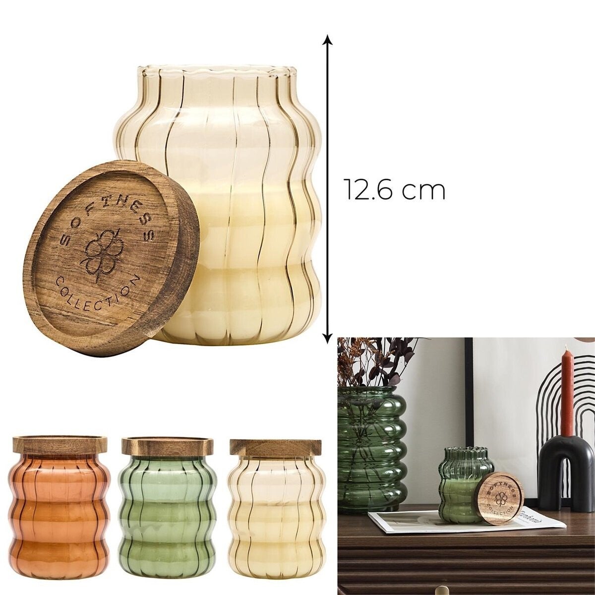 Kaars in glas met golvend design, afgewerkt met een deksel van natuurlijk hout, geeft uw interieur een chique en tijdloze toets. Assortiment 3 kleuren/geuren. Geur: Amber, Brume des bois, Fleur de Coton. afmeting: 9 x 12.6 x 9cm